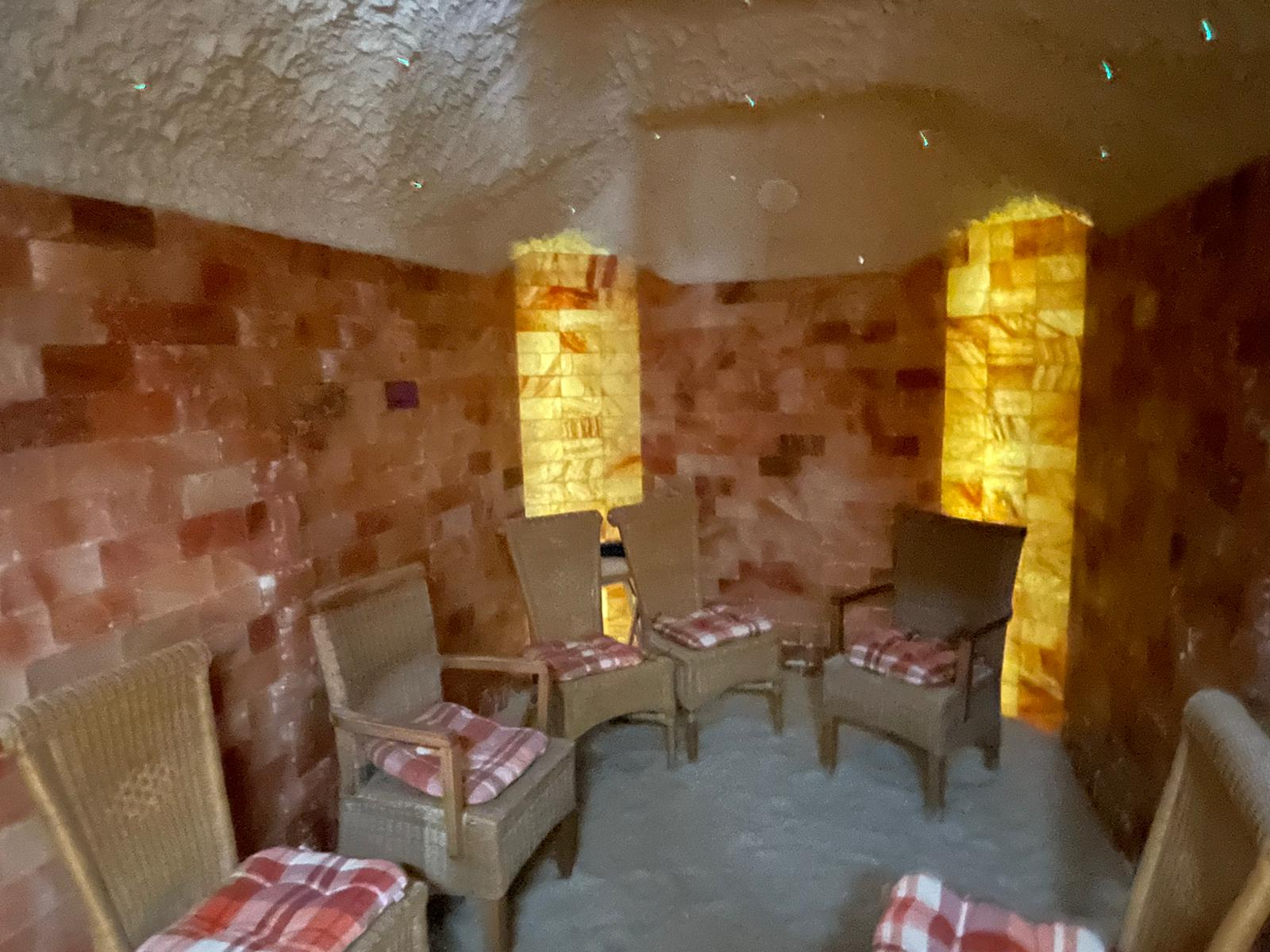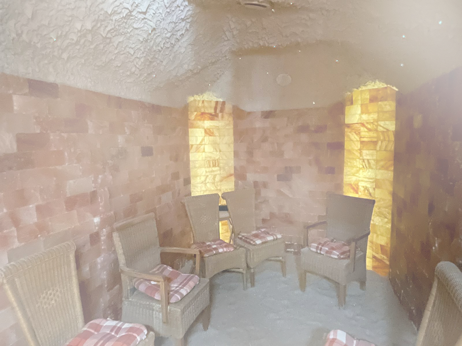 Dies geschieht in der entspannenden Atmosphäre einer Solekabine mit Salzziegeln und Sternenhimmel.